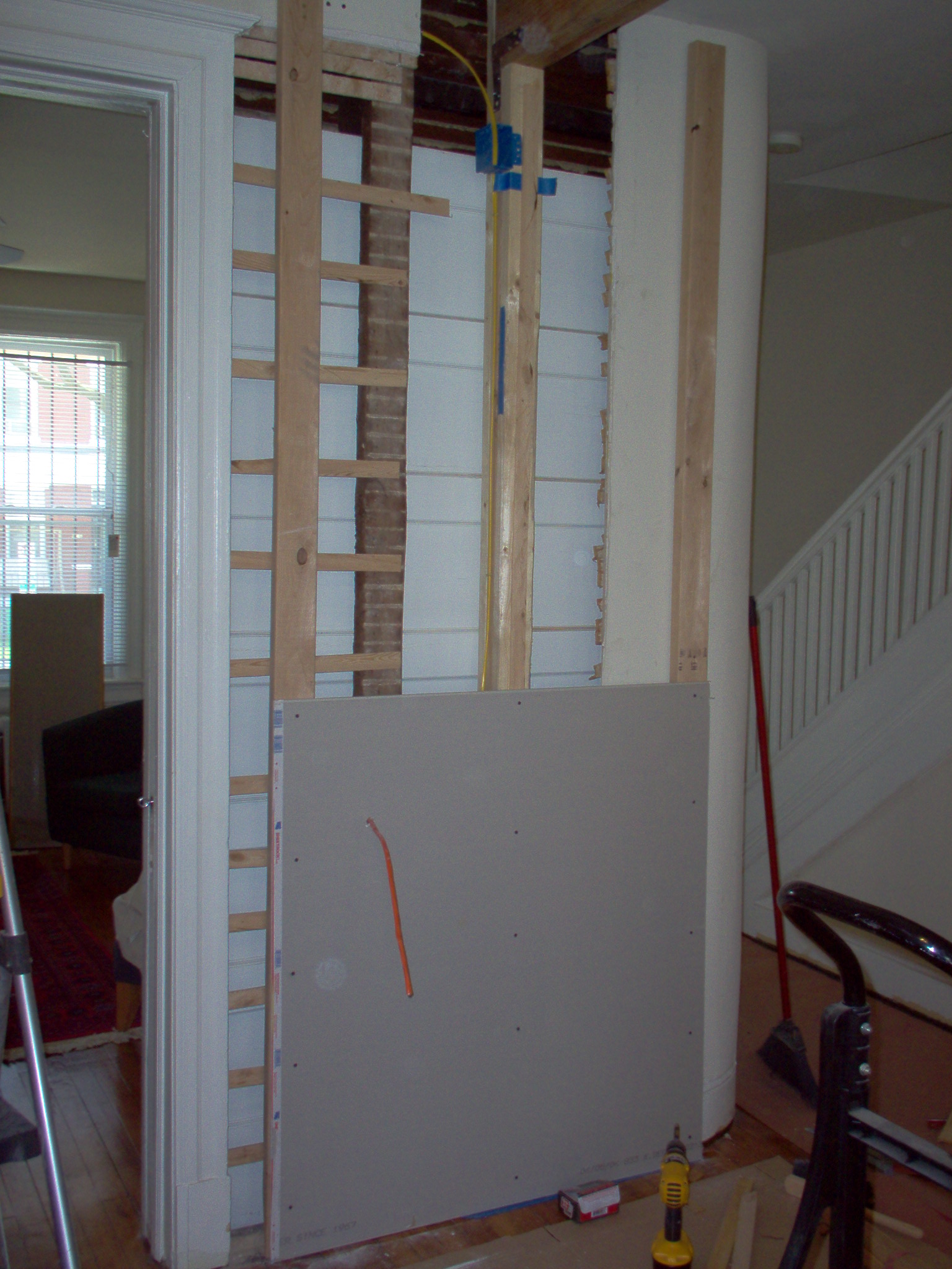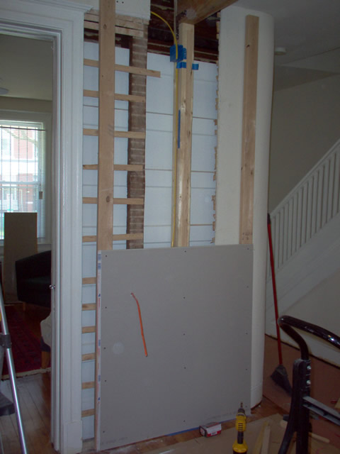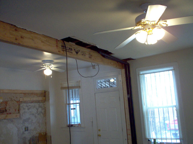 This is the header we installed. Fabricated out of 2 1.75x9.25 GPLam LVL boards bolted together Simpson Strong-Tie SDS screws. This supports the load the old wall previously held. |
