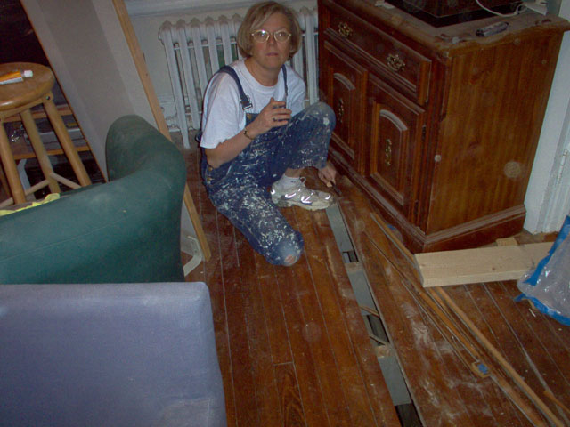 Mom cleans up the wood around where we removed a damaged floor board before we replace it. |