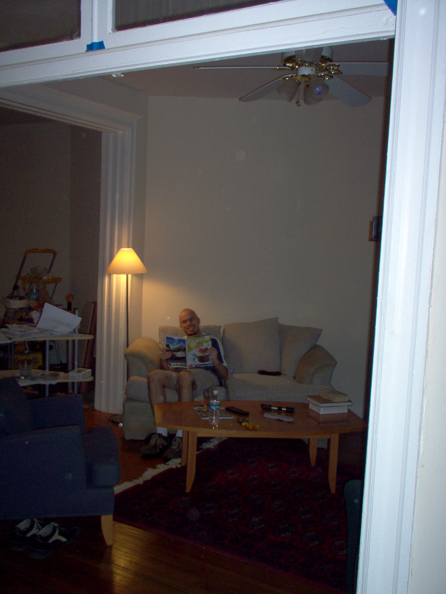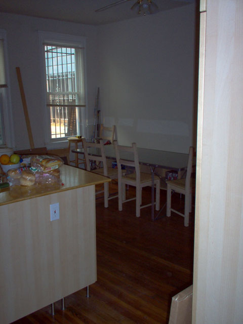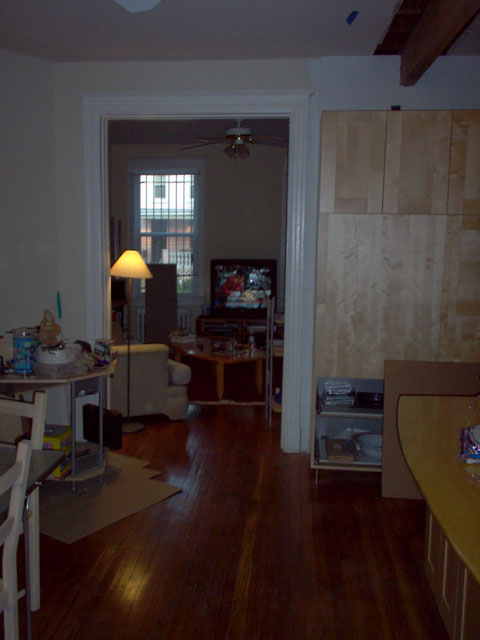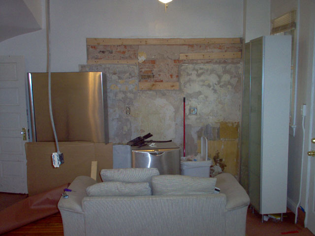 The kitchen once all the cabinets were removed and the sofa was moved into it so that the other side of the floor oould be refinished. |