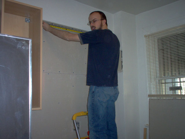 Measuring screw locations before hanging a wall cabinet |