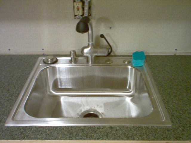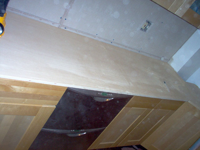 3/23/2004 The counter top has been cut down to size, and the edges routered. A hole has been cut in the top for the cooktop to be placed into. Next I need to sand, and coat with Spar Varnish. |